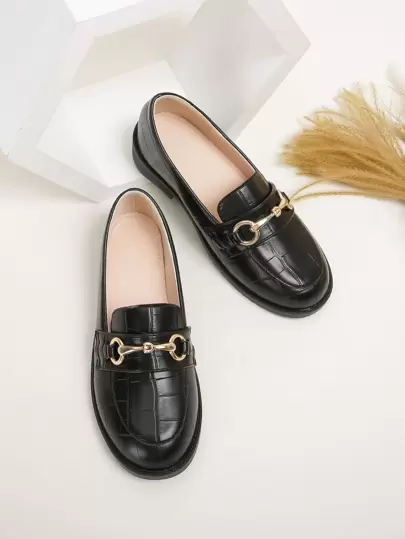 Mocasines con decoración de hebilla de caballo y estampado de cocodrilo para niñas - Negro - Añade 1