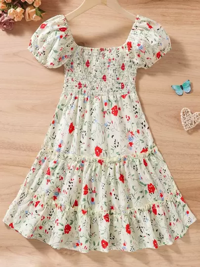 Niñas Vestido con estampado floral con fruncido de manga farol bajo con fruncido