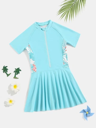 Chicas Bañador una pieza con estampado tropical con cremallera delantera - Azul - Añade 5