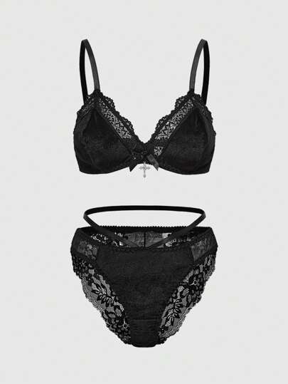 ROMWE Goth Conjunto de lencería gótica de terciopelo oscuro con encaje, sujetador y pantis con triángulos - Negro - Añade 4