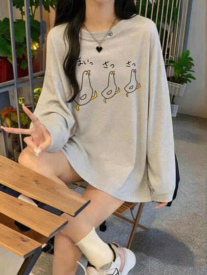 Camiseta de manga larga con cuello redondo y estampado gráfico de dibujos animados en gris para mujer, nuevo diseño holgado que luce genial como capa base, para principios de otoño - Gris claro - Añade 1