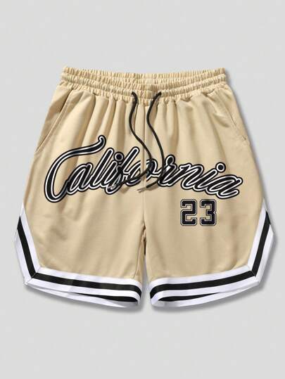 ROMWE MEN Prep Pantalones cortos con cordón en la cintura, gráfico de letras y ribete a rayas, para hombres, escuela - Caqui - Añade 1