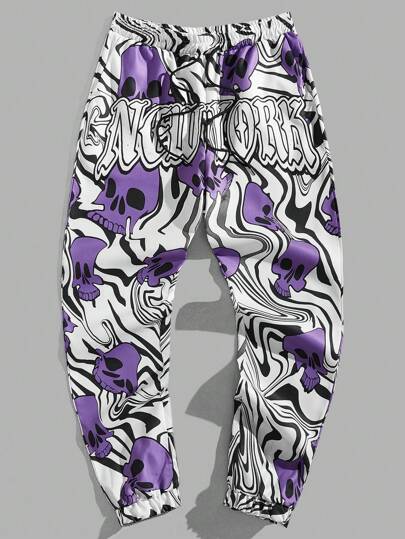 ROMWE MEN Goth Hombres Pantalones con estampado de cráneo y letra de cintura con cordón - Multicolor - Añade 5