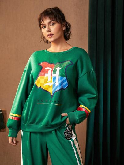 HARRY POTTER X SHEIN Talla grande Sudadera con estampado de letra de hombros caídos - Verde - Añade 2