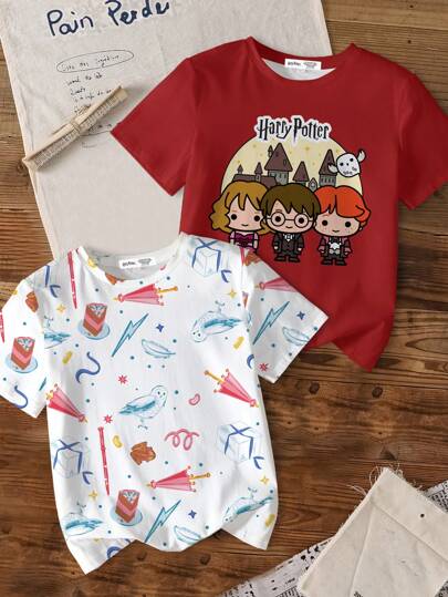 HARRY POTTER X SHEIN Paquete múltiple de camisetas de manga corta con cuello redondo y estampado de dibujos animados para niñas preadolescentes - Multicolor - Añade 2