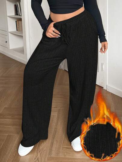 SHEIN EZwear Pantalones casuales anchos y sueltos de talla grande para mujer, de unicolor, con cintura con cordón y costillas - Negro - Añade 6