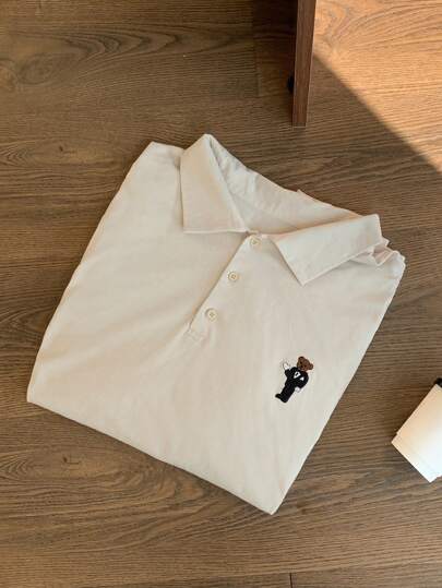 Dazy Plus Camiseta de manga corta de cuello medio abierto y holgada con bordado de oso, primavera/verano - Albaricoque - Añade 5
