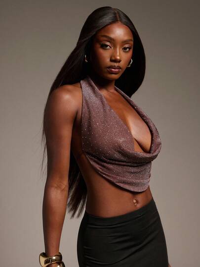 Hauture Top sin espalda con cuello de halter brillante, elegante y sexy con lentejuelas y strass para mujer - Marrón - Añade 4