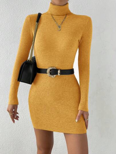Chiquease Vestido de suéter de punto ajustado de color liso con cuello alto, casual para otoño/invierno - Amarillo - Añade 5