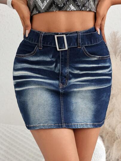 SHEIN Privé Falda en mezclilla de talle alto con cinturón ajustado - Azul lavado oscuro - Añade 6