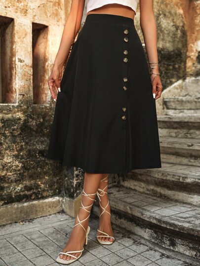 SHEIN VCAY Falda de talle alto con diseño de botón - Negro - Añade 5