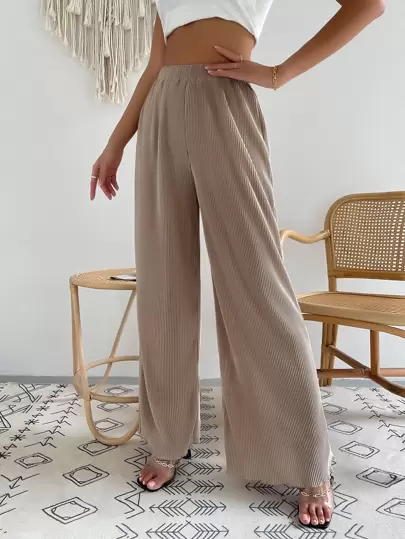 SHEIN LUNE Pantalones de pierna ancha de talle alto unicolor - Caqui - Añade 5