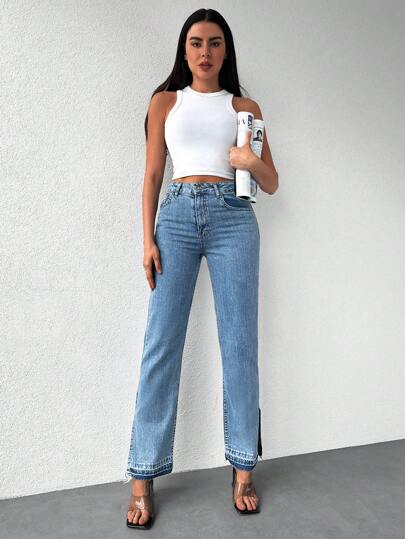 Cottnline Jeans de pierna recta de talle alto bajo con abertura - Azul lavado medio - Añade 4