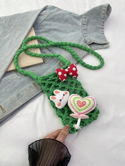 Bolsa de teléfono de punto hueca, bolsa pequeña colgante diagonal de un solo hombro con peluche - Verde - Añade 3