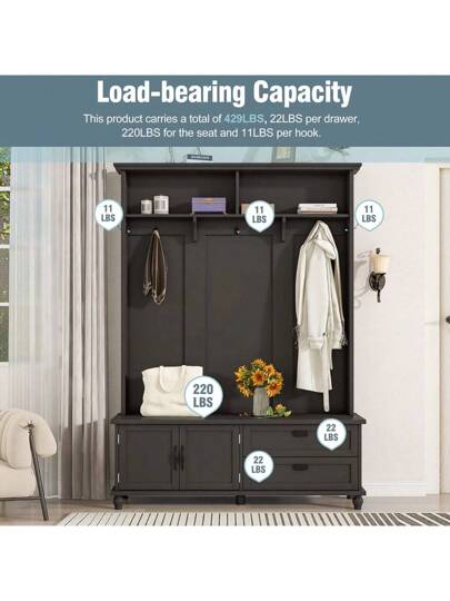 MERAX Árbol de entrada moderno con gabinete de almacenamiento y 2 cajones grandes, banco para el recibidor con 5 ganchos para abrigos - Negro - Añade 10