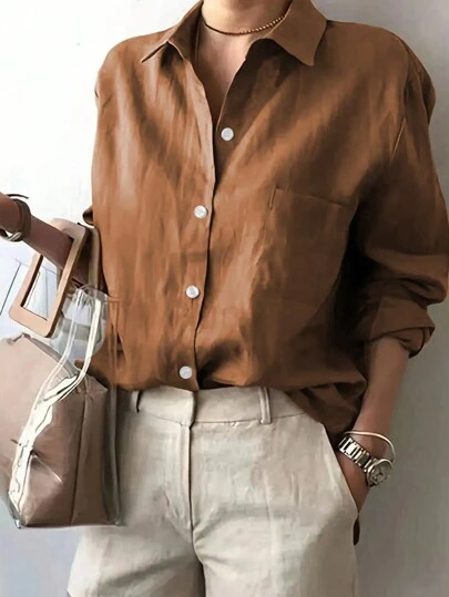 INAWLY Camisa casual de manga larga y talla grande de unicolor para primavera/verano/otoño - Café integral - Añade 1
