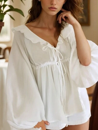 INAWLY Conjunto de 2 piezas de blusa con mangas de farol con volante y lazo delantero, y shorts para mujer talla grande, para primavera, verano y otoño - Blanco - Añade 1