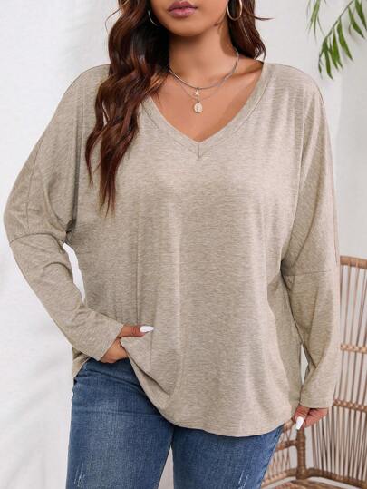 INAWLY Talla grande Camiseta unicolor de manga murciélago de cuello V - Caqui - Añade 8