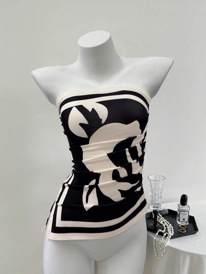 INAWLY Top bandeau con volantes y contraste de color floral para vacaciones de la mujer - Blanco y Negro - Añade 1