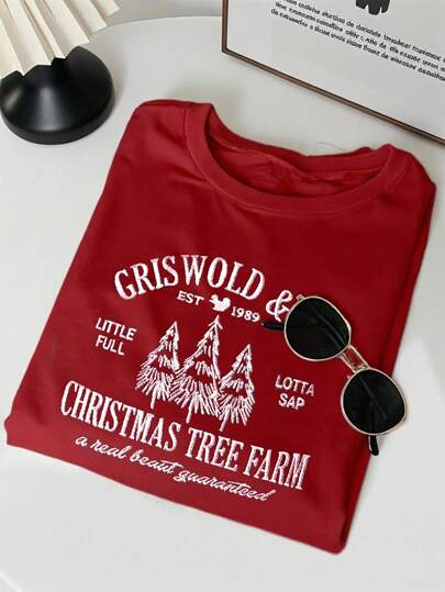 INAWLY Sudadera casual de mujer con hombros caídos, bordado de árbol de Navidad y letras, para primavera y otoño - Rojo - Añade 1