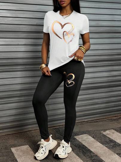 INAWLY Conjunto De Camiseta De Manga Corta Con Estampado De Corazón Y Pantalones Para Mujeres - Blanco y Negro - Añade 1