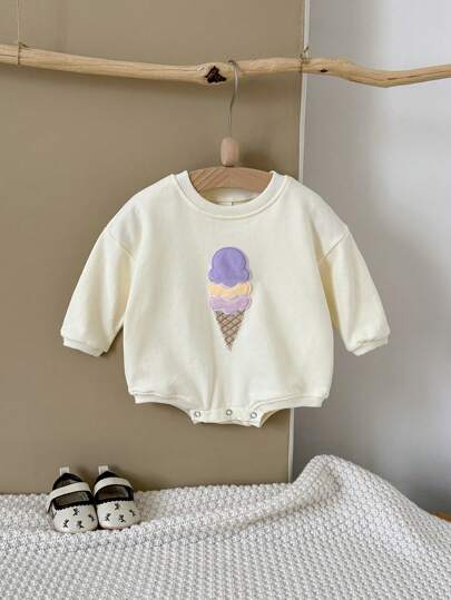 Mono de manga larga suave con bordado de helado lindo para bebé niña/niño, primavera/otoño - Beis - Añade 1