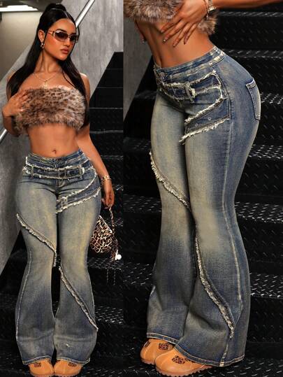 Jeanoix Jeans acampanados de mujer con diseño de hebilla en la cintura - Azul lavado medio - Añade 1