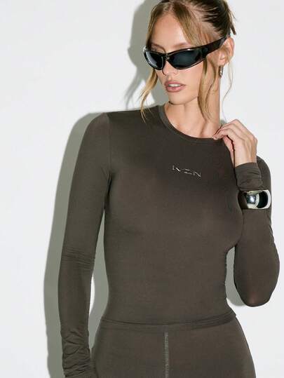 KIZN Mono de manga larga con ajuste ceñido, diseño de cuello alto, detalle con logotipo metálico, tela de jersey elástica, esencial de moda básica clásica de otoño e invierno, material suave y transparente - Café integral - Añade 1