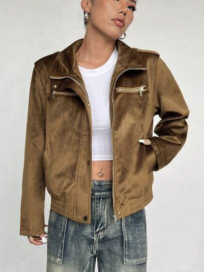 Flirla Chaqueta corta casual versátil de color caqui con estilo retro para ropa de fiesta de vacaciones - Café integral - Añade 5