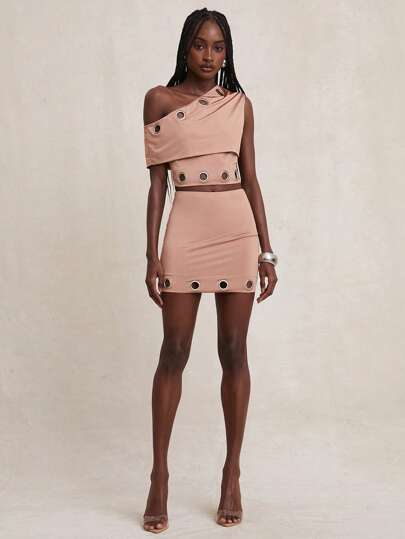 NYA SZN Top asimétrico con hombros al descubierto, detalles de ojal, para eventos, club, fiestas, salidas, primavera, verano, vacaciones - Top corto y conjunto de ropa para mujer - Marrón - Añade 1