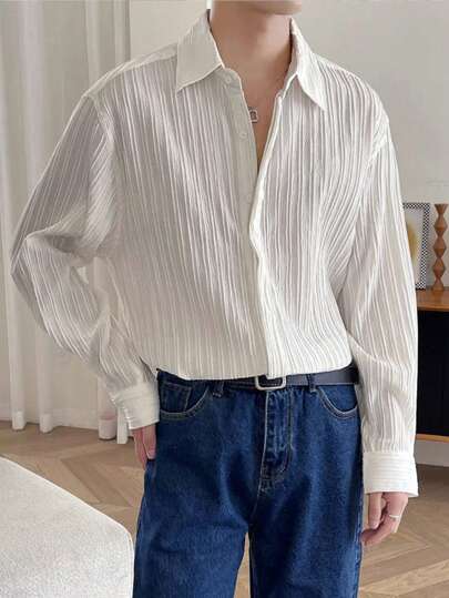 Camisa casual de hombre de unicolor con textura ondulada de tela tejida, diseño minimalista elegante, adecuado para actividades al aire libre, viajes, camisa esencial de manga larga con cuello versátil - Beis - Añade 5