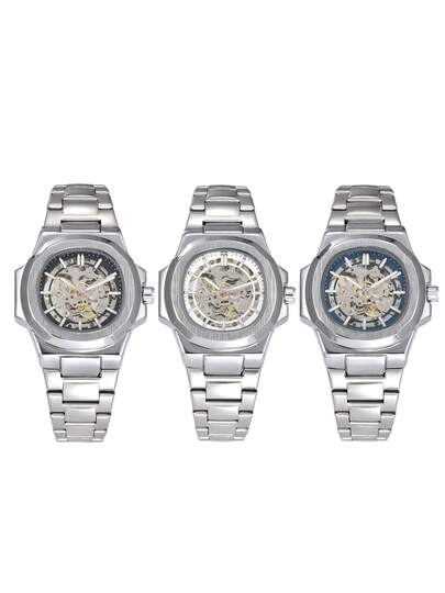 LONGLUX 1 pieza Reloj automático mecánico hueco para hombres, estilo de negocios minimalista con correa de acero inoxidable, adecuado para uso diario y como regalo - Multicolor - Añade 15