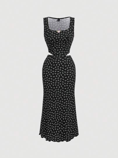 SHEIN MOD Conjunto De Top Y Falda De Camisola De Dobladillo De Pañuelo Para Mujer Con Estampado Floral - Negro - Añade 1