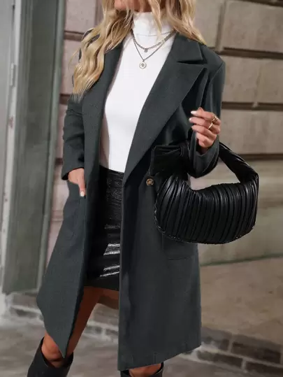 SHEIN LUNE Abrigo de cuello con solapa con doble bolsillo con botones - Gris Oscuro - Añade 1