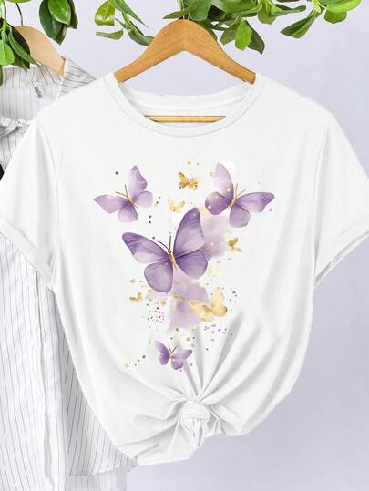 SHEIN LUNE Camiseta de manga corta y cuello redondo con estampado de mariposa, de talla grande, sencilla y de moda - Blanco - Añade 1