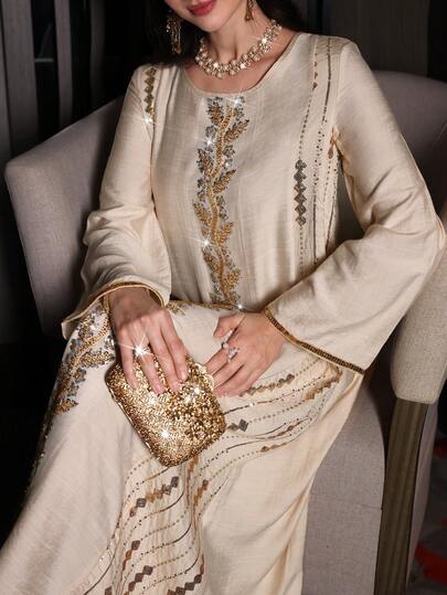 Layrah Vestido elegante de manga larga acampanada con cuello redondo, bordado y con cuentas, para primavera/verano - Albaricoque - Añade 1