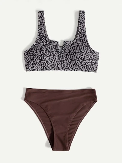 Bikini con aros en V con estampado de leopardo para vacaciones de verano en la playa - Multicolor - Añade 1