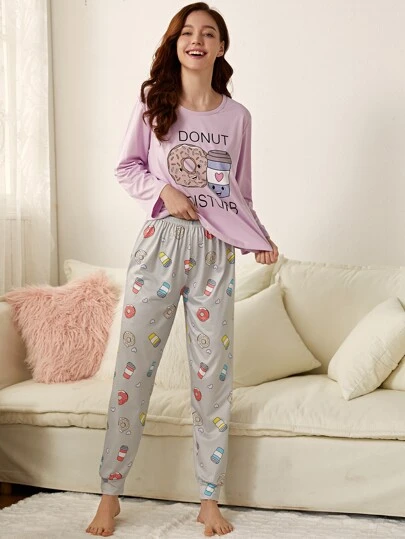 Conjunto de pijama con estampado de letra y dibujos animados - Multicolor - Añade 2