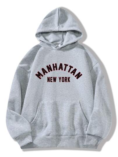 SHEIN EZwear Capucha térmica con estampado de letra con bolsillo de canguro con cordón - Gris Claro - Añade 6