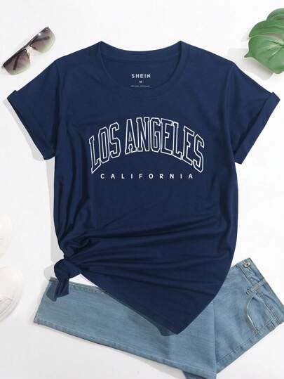 INAWLY Camiseta con diseño gráfico de letras, camisetas gráficas para mujer - Azul Marino - Añade 5