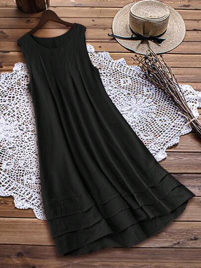 Linhara Vestido casual de talla grande de unicolor sin mangas y cuello redondo para medio de verano - Negro - Añade 1