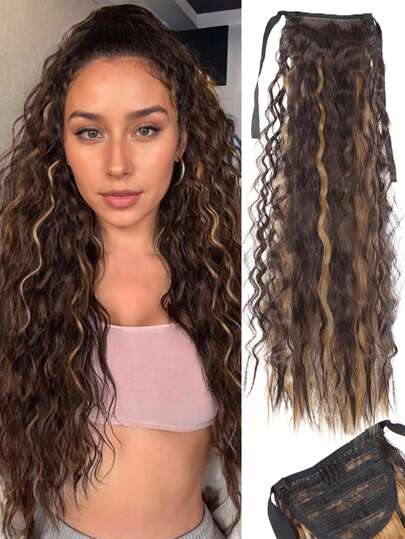 Extensión de coleta rizada larga de 32 pulgadas de color negro, de fibra sintética con clip para uso diario de las mujeres (rizado o liso) - Resaltar Rubio - Añade 2