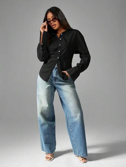 MISSGUIDED Camisa de algodón con botones y manga larga para uso profesional en la oficina y de trabajo, blusa de cuello - Negro - Añade 3