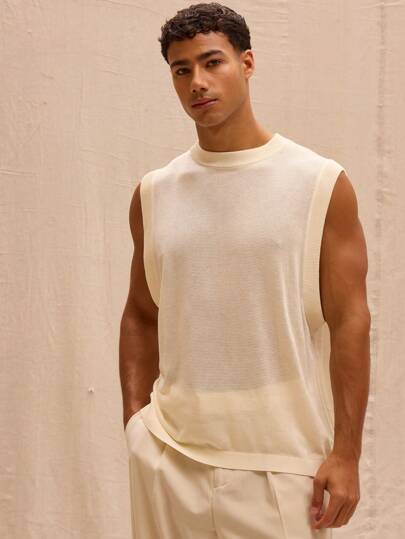 SHEIN X Scheana Musero Chaleco de punto de malla con cuello de canalé, corte holgado, para verano, estilo urbano y casual - Beis - Añade 3