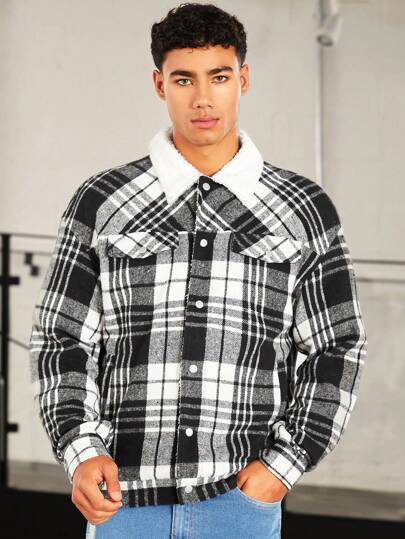Manfinity VCAY Chaqueta de hombre de cuello de borrego con estampado de cuadros sueltos y hombros caídos, para otoño e invierno - Caqui - Añade 6