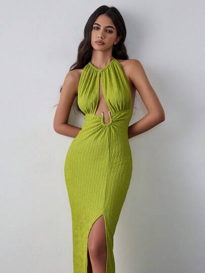 Chiquease Vestido de cuello halter sexy con espalda descubierta, abertura alta y unicolor - Verde - Añade 1