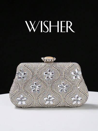 Bolso de mano de lujo con decor de lentejuelas y strass, diseño floral y de diamantes, adecuado para ocasiones formales, fiesta/boda/graduación, bolso de noche brillante con cadena - Plateado - Añade 1