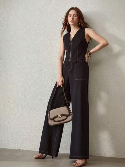 MOTF PREMIUM JEANS DE PIERNA ANCHA CON BOLSILLOS INCLINADOS Y PESPUNTES DE CONTRASTE - Azul lavado oscuro - Añade 1