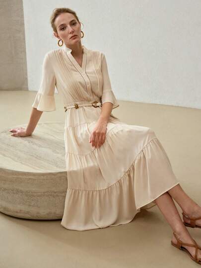 MOTF PREMIUM VESITDO CON CUELLO DE MUESCA, MANGA ACAMPANADA Y DOBLADILLO ESCALONADO - Albaricoque - Añade 1