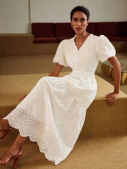 MOTF PREMIUM Vestido Schiffy Plegado Con Cuello En V Y Manga Abullonada - Blanco - Añade 2